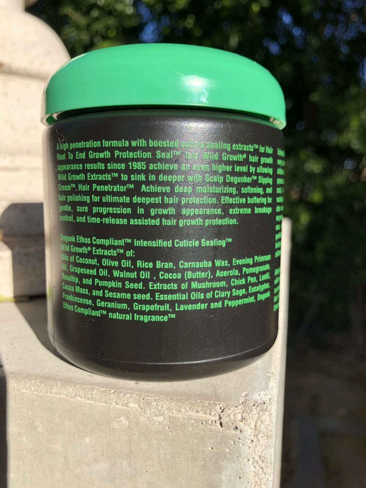Degunk Ethos Compliant™ proprietary methods of packing multiplied power into already time proven Wild Growth® hair and scalp products . The formula goes to work immediately leaving no oily/sticky mess on hair and scalp since it penetrates into rather than linger on the surface. One 8 ounce jar contains alot of 'a little goes a long way'!